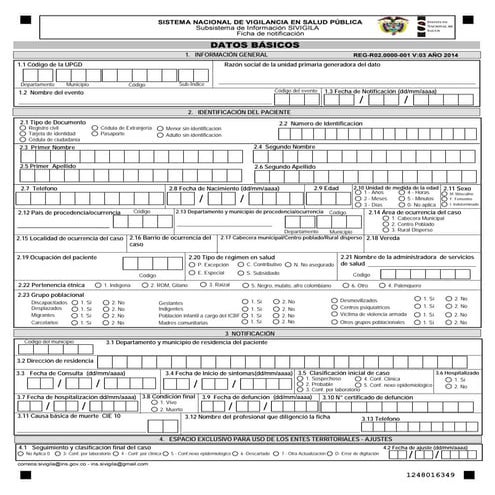 La ficha de notificación es para fines de vigilancia en salud pública y todas las entidades que participen en el proceso deben garantizar la confidencialidad de la información LEY 127309 y. DESCARGAR FICHAS Y PROTOCOLOS POR EVENTO. Colombia Dengue Exposición rábica Chikungunya In.